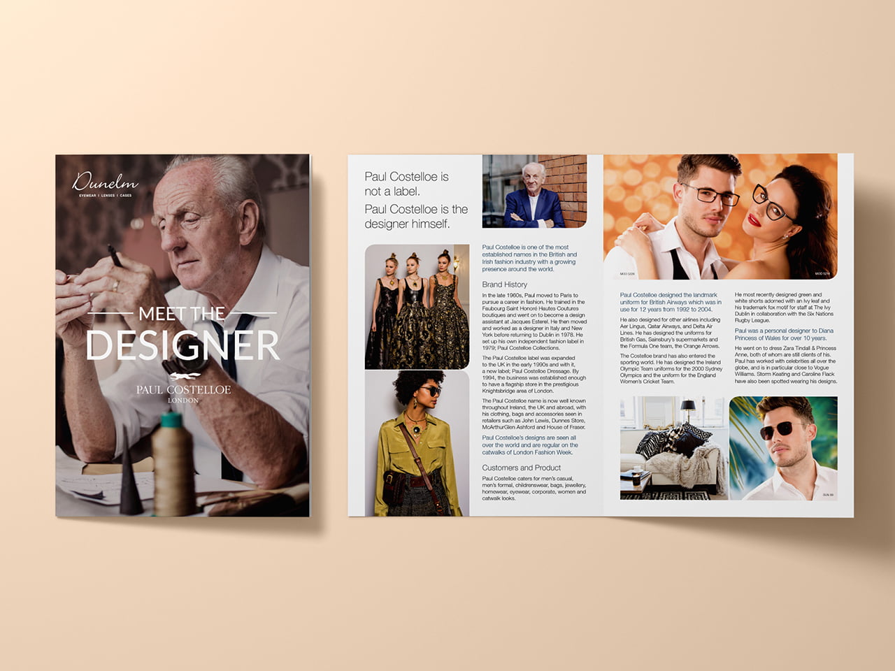 Every year Paul Costelloe launches its new eyewear collection and our job is to source and select the models, create and direct the photoshoot, arrange hair, makeup and stylists, call sheets, travel and accommodation, right through to final image selections and retouching. All approved by Paul Costelloe on behalf of Dunelm Optical.